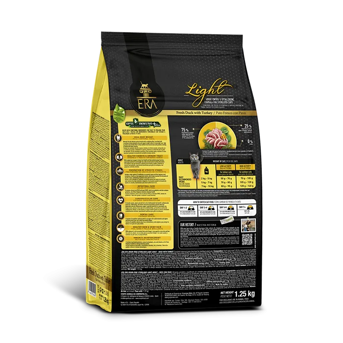 Al ser libre de cereales, este alimento es especialmente adecuado para gatos con sensibilidades alimentarias o problemas digestivos, proporcionando una opción segura y saludable. Con el pienso ERA Grain Free Light Pato y Pavo, puedes estar seguro de que estás brindando a tu gato una alimentación de alta calidad que no solo satisface sus necesidades nutricionales, sino que también le ayuda a mantener un peso ideal, y a estar feliz y saludable a lo largo de su vida.
