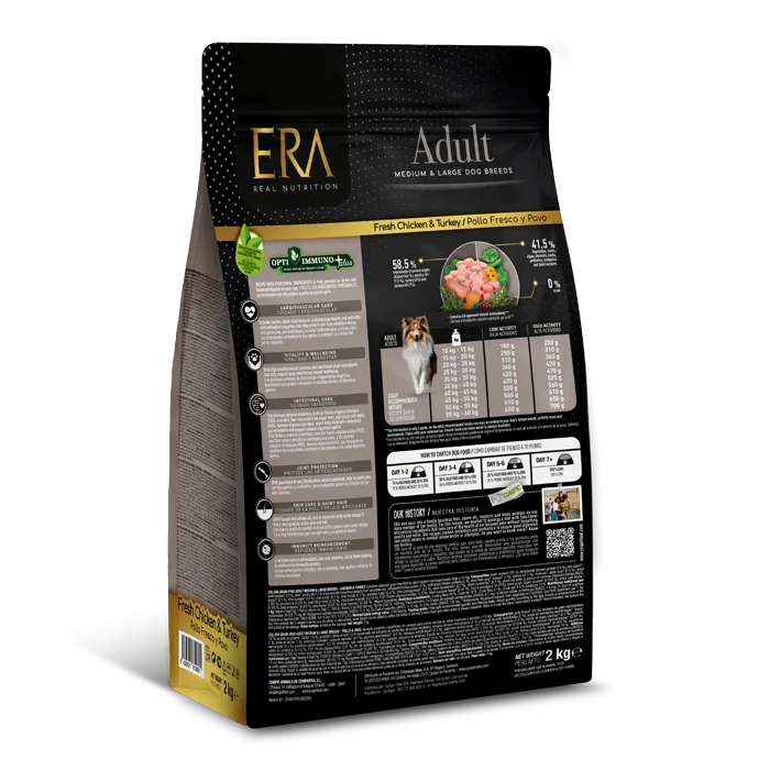 La gama ERA Grain-Free de pollo y pavo es exclusiva por su alta calidad, producción en un solo proceso térmico y la selección de ingredientes funcionales OptiImmuno+, que promueven la salud y el bienestar de tu perro.